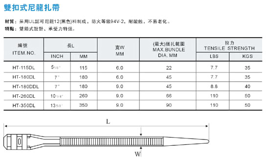 材料:该产品采用PA66原料制作,且该材料通过美国UL认可,防火等级为9V-2、耐酸、耐蚀、阻燃、绝缘性能良好不易老化、自锁式设计承受力特强。我们专注尼龙扎带的生产研发,我司生产的尼龙扎带均符合欧盟ROHS认可,质量性能由ISO9001国际质量体系控制,产品的结构的设计均符合市场的要求。