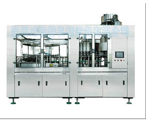 純凈水灌裝生產(chǎn)線的工作過程:將瓶子通過風道傳送,然后通過星型瓶傳送到三合一清洗機中。洗瓶機的旋轉(zhuǎn)板配有瓶夾,該瓶夾夾住瓶口,并沿導軌旋轉(zhuǎn)180°以使瓶口朝下。在洗瓶機的特定區(qū)域中,洗瓶機夾的噴嘴噴灑洗瓶水以沖洗瓶內(nèi)壁。沖洗并瀝干瓶子后,用瓶子夾夾住瓶子,并將其沿瓶子的口朝上沿著導軌旋轉(zhuǎn)180°。清洗后的瓶子通過洗瓶星輪從洗瓶機中輸出,并轉(zhuǎn)移到灌裝機中。進入灌裝機的瓶子被瓶頸塞住,凸輪抬起瓶子,并且裝料閥在瓶子的開口處打開。填充方法使用重力填充方法。填充閥打開后,物料通過填充閥完成填充過程。灌裝完成后,瓶子的嘴巴下降,離開灌裝閥,瓶子通過瓶頸過渡刻度盤進入旋蓋機。旋蓋機的防旋轉(zhuǎn)刀會堵塞瓶頸,并使瓶子保持直立以防止其旋轉(zhuǎn)。壓蓋頭在壓蓋機上不斷旋轉(zhuǎn),凸輪的作用實現(xiàn)了壓蓋,壓蓋,壓蓋,壓蓋操作,并完成了整個壓蓋過程。成品瓶子通過出瓶撥盤輪從封蓋機傳送到瓶子傳送鏈,三合一機器由傳送鏈傳送。